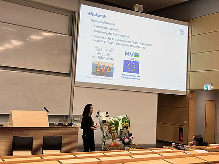 Am 25./26.09.2025 fand die 120ste Jahrestagung der Deutschen Gesellschaft für Züchtungskunde (DGfZ) in Rostock statt. Als Schwerpunktthema war „KI in der Nutztierhaltung“ ausgelobt, wozu zum Auftakt eine Plenartagung mit drei Referent:innen und anschließender Podiumsdiskussion stattfand. Hier hat Sandra Düpjan vom FBN einen Vortrag mit dem Titel „Von sprechenden Schweinen und lauschenden KIs – der potentielle Nutzen von Lautanalysen in der Schweinehaltung“ gehalten, in dem natürlich auch ein Verweis auf KI-Tierwohl nicht fehlen durfte. Im Übrigen wurde unser Forschungsverbund bereits im Grußwort von Minister Dr. Backhaus hervorgehoben.